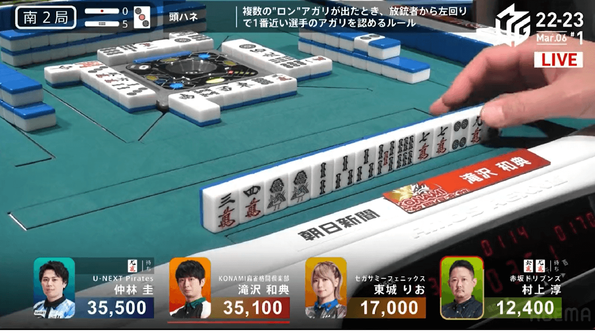 村上淳選手と仲林圭選手、両方がロン!頭はねで、村上があがる