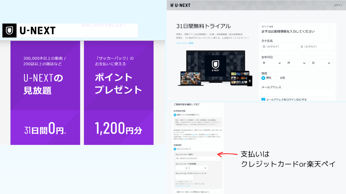U-NEXT月額プランの無料トライアル31日間+サッカーパック申込で1200ポイント付与